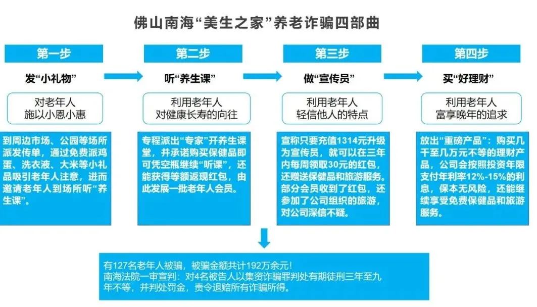 法院审理查明,2020年7月,甘某等4人在南海区大沥镇设立“美生之家”公司,并通过制定“顾客邀约话术”、精心设计布置办公室和讲课场所包装成一家 “养生公司”。公司成立后,在周边市场、公园等场所派发宣传单,以免费派小礼品等方式吸引老年人注意,以“养生保健”“慈善关爱”的旗号打消老年人顾虑,让老年人到公司听“养生课”。课中,又以送保健品、赠旅游、充值返利、拉客有奖等为诱惑,发展了一批老年人成为会员。其后,利用有些老年人不熟悉上网,该公司开发了所谓的在线理财平台,以“高回报”“无风险”对外兜售理财产品,承诺老年人在购买理财产品后,可随时在线查询理财情况。为骗取老年人信任,公司还经常开展发放理财现金分红、免费赠送保健品和组织免费旅游等活动。先后有127名老年人被骗192万余元。