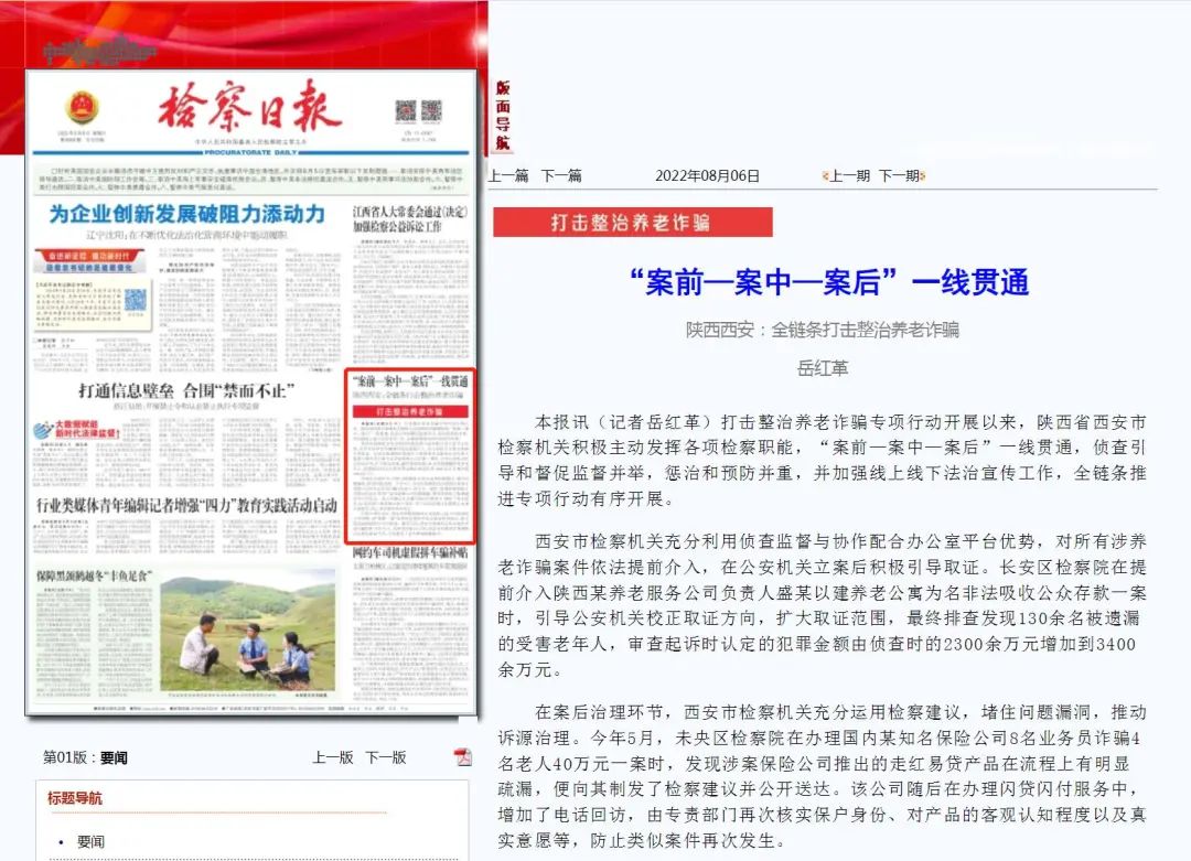 在案后治理环节,西安市检察机关充分运用检察建议,堵住问题漏洞,推动诉源治理。今年5月,未央区检察院在办理国内某知名保险公司8名业务员诈骗4名老人40万元一案时,发现涉案保险公司推出的走红易贷产品在流程上有明显疏漏,便向其制发了检察建议并公开送达。该公司随后在办理闪贷闪付服务中,增加了电话回访,由专责部门再次核实保户身份、对产品的客观认知程度以及真实意愿等,防止类似案件再次发生。