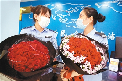 5月20日中午,公安新城分局出入境办证窗口女警郑博鑫、江小清分别收到了来自男朋友和追求者的“表白”鲜花。