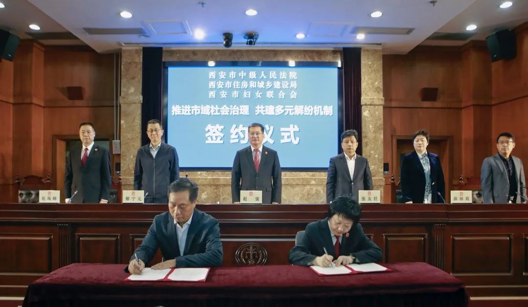 西安中院分别与市住建局、市妇联签署了《关于建立全市物业服务管理领域治理工作联系机制的协议》《关于促进市域社会治理妥善化解婚姻家事纠纷的共建协议》《关于共建西安市中级人民法院婚姻家事案件调解中心的协议》,并与市妇联共同为西安市中级人民法院婚姻家事案件调解中心和西安市婚姻家庭纠纷人民调解委员会茜茜调解室揭牌。