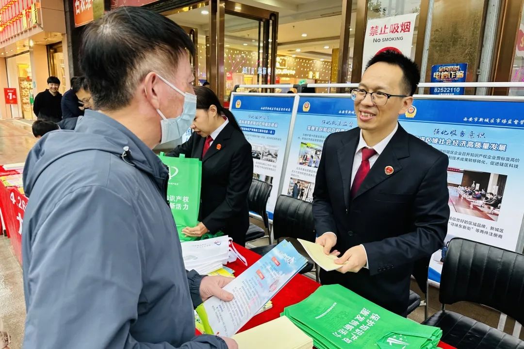 新城区检察院知识产权办公室在西北小商品交易中心设立咨询台,向群众发放知识产权宣传彩页,现场解说知识产权相关法律规定,并通过介绍发生在身边的侵犯知识产权典型案例,让现场群众、商家对侵犯知识产权犯罪的危害性有了更直观的认识。针对附近商户较多的情况,宣传人员重点加强对商标权、专利权等权益的解读,同时向过往群众介绍维权方式和维权渠道,鼓励大家积极提供违法犯罪线索,建议大家维护自身权益的同时,尊重他人知识产权。