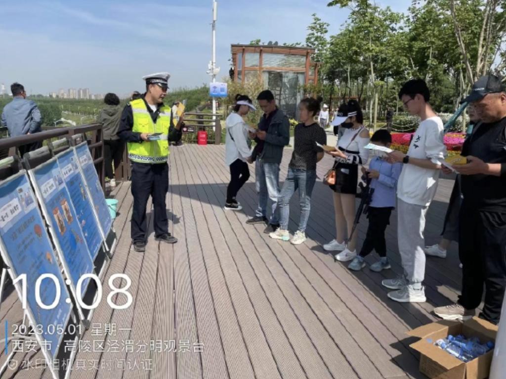 5月1日,交警高陵大队民警结合自驾出游、长途出游等交通出行特点,在假日期间,前往辖区泾渭分明旅游景点,向游客、群众发放交通安全宣传资料,面对面向群众宣讲日常出行或外出游玩时的交通安全注意事项,时刻谨记关注交通安全。