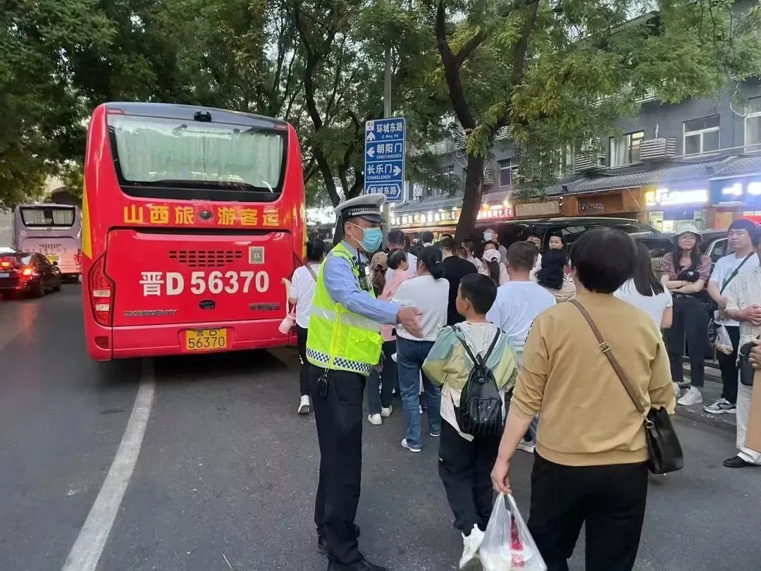 新城大队解放路中队民警不间断在永兴坊景区疏导交通,引导游客快速上下车、大巴车规范停放,清理无序乱放共享单车,提升游客游览体验。