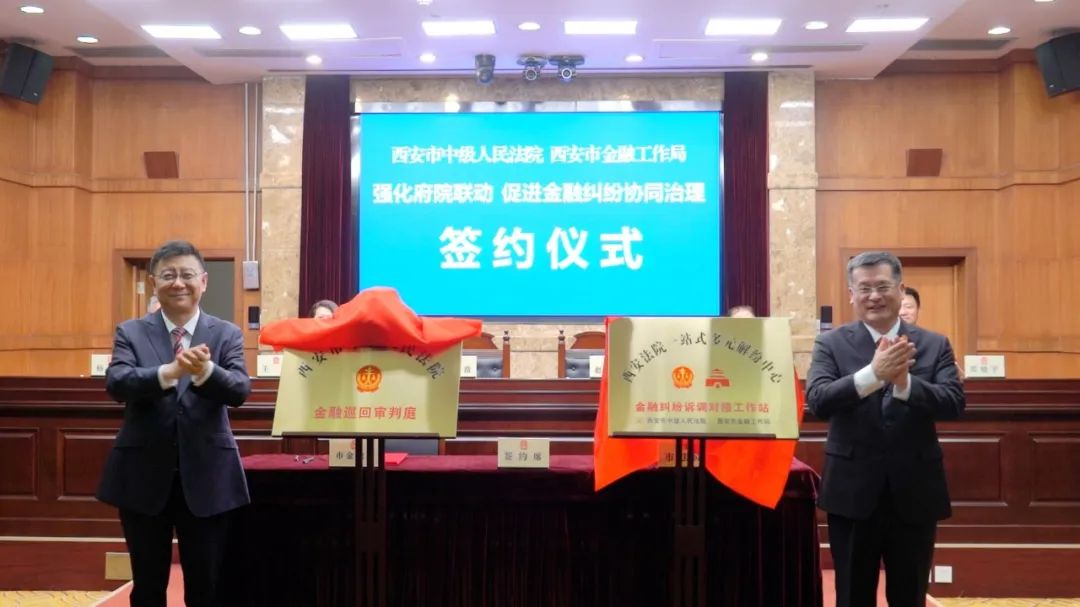 西安市政府党组成员、副市长孟浩,西安市中级人民法院党组书记、院长赵雷出席会议并致辞,共同为“西安法院一站式多元解纷中心金融纠纷诉调对接工作站”“西安市中级人民法院金融巡回审判庭”揭牌。市金融局党组书记、局长王丽,西安中院党组成员、副院长赵海峰,西安中院党组成员、政治部主任邓晓宇,市金融局党组成员、副局长杨勇等参加会议。