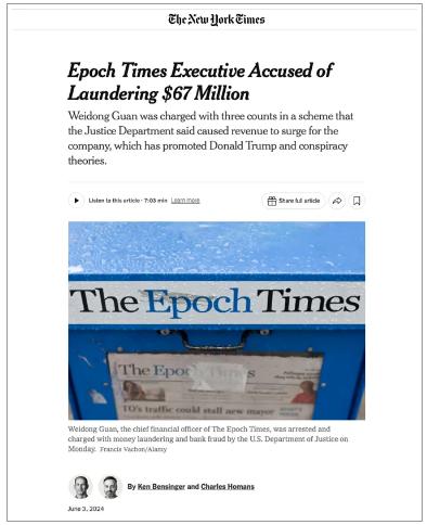 检方还表示,当银行和加密货币交易平台就涉及《大纪元时报》账户的大量可疑交易一事询问关伟东时,他一再否认存在任何违规行为,并谎称资金的增加主要是来自于发行量上涨和捐款,称这代表“(《大纪元时报》)支持者的捐款越来越多,越来越多的人喜欢我们的媒体”。