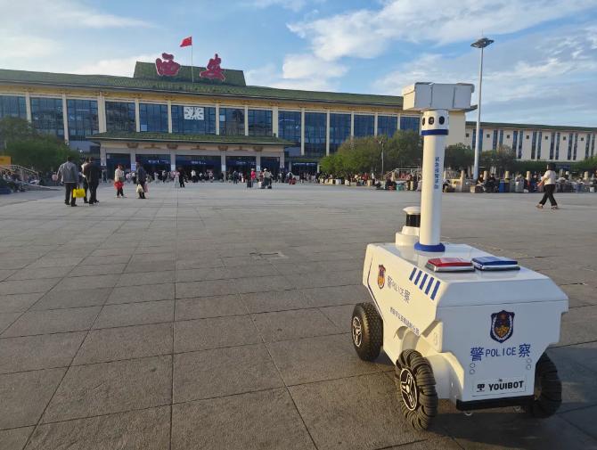 这台警用机器人,它的名字叫“暖暖”,取自暖心服务广大过往旅客之意,是西安市公安局站前分局新投入使用的一件科技含量十足的新式警用装备。它集巡逻、报警、宣传、服务等于一身,功能不可谓不强大。“暖暖”可是十分地聪明呢,广场地图已在它的大脑之中,根据实际情况,它可以自己规划巡逻路线,识别可疑人员,提前发出预警;如果你在火车站广场遇到突发情况,也可以寻求“暖暖”的帮助,它的一键报警功能连接的是指挥中心后台,可以实现实时通话;另外,在“暖暖”巡逻过程中他还可以播放“反诈”“防盗”等安全知识,时刻提醒人们提高警惕以防被骗、被盗;在火车站找不到要乘坐的公共交通工具,你还可以与它进行人机对话,它会给你提供火车站地区的公交、地铁等公共交通出行信息。西安火车站作为西北地区重要的交通枢纽,平常时日均客流量十余万人,节假日可达二三十万。如何能为广大旅客提供更加安全、温暖、便捷的出行体验是西安公安站前分局党委一直在思考的一个课题。警用机器人“暖暖”就是一个很好的实践,科技赋能现代警务,向科技要新质公安战斗力正在站前分局一步步得以实现。
