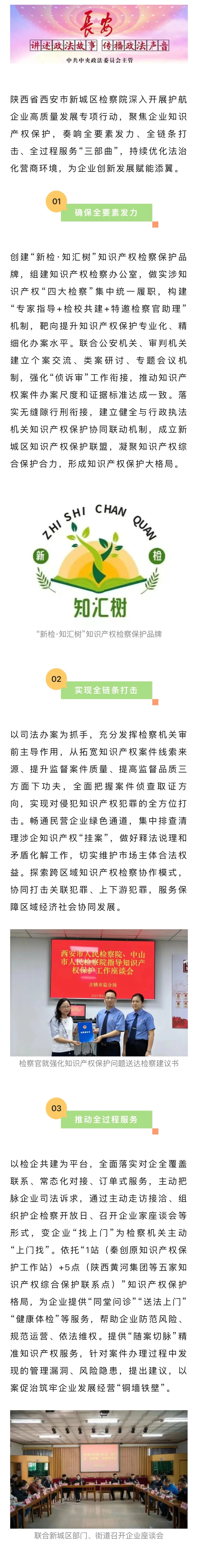 5月19日,中央政法委《长安》杂志新媒体平台“长安评论”推送文章《检察服务“三部曲”为企业知识产权保护赋能添翼》,充分展示了新城区检察院开展护航企业高质量发展专项行动,强化企业知识产权保护,持续优化法治化营商环境的良好成效。以下为全文: