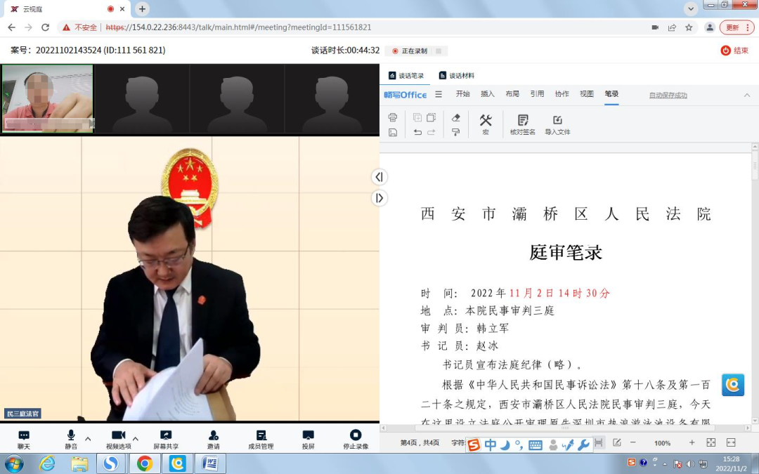 “云视庭”是灞桥区法院于近期成功上线的全省首家跨网融合、内外联通的办案平台!旨在进一步推进智慧法院建设、切实提升审判质效、为群众提供更加优质的司法服务。“云视庭”平台整合实时音视频交互、笔录智能生成、电子签名、在线提交材料、同步录音录像等功能,为群众诉讼、法官办案提供全时空、泛在化的在线司法辅助服务。