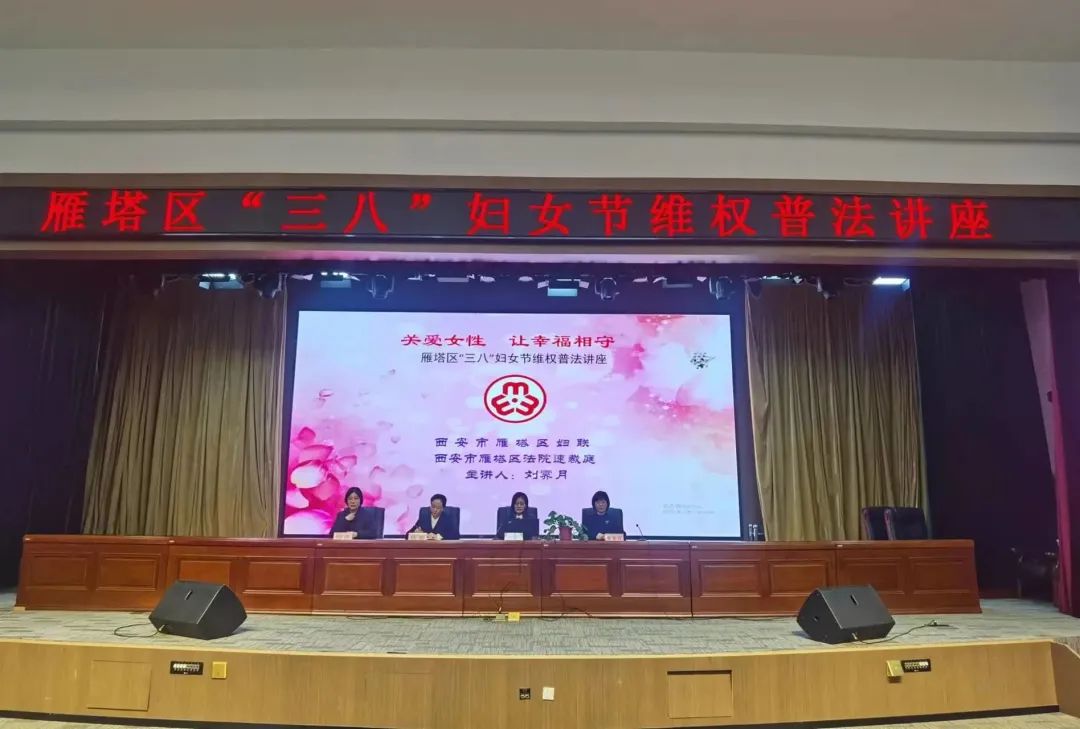 阳春三月,风和日丽。为有效预防和化解基层矛盾纠纷,提高基层妇女干部的调解水平及化解群众矛盾纠纷能力,在第113个国际妇女节来临之际,3月3日上午,雁塔区妇联举办妇女权益保障普法活动,雁塔法院速裁庭受邀为雁塔区妇女工作者进行专题讲座。旨在通过专题讲座普及法律知识,帮助妇女工作者提高法律意识,用好法律武器,当好法律知识的宣传者,做好维权行动的推动者和实践者。区妇联主席杨静、副主席董黎君,雁塔法院速裁庭庭长何燕,各街办、社区妇女工作者约260人参加活动。