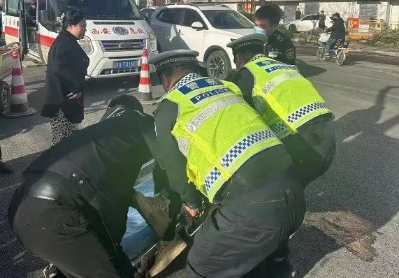 查看群众情况,并迅速在其周围摆放安全锥桶,引导过往车辆避让。由于该群众