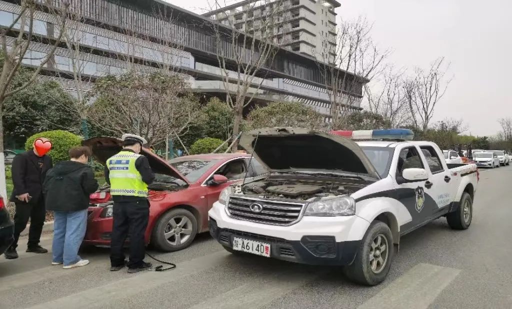 民警张建辉在迎宾大道西航职院考点附近执勤时,一名考生家长向交警求助:自己驾驶的轿车打不着火了,着急送孩子考试,需要民警帮助。民警立即把警车开到故障车前,并用电源连接线把两车连接起来,接通电源后成功将车辆启动,让考生家长在开考前顺利把考生送至考场。