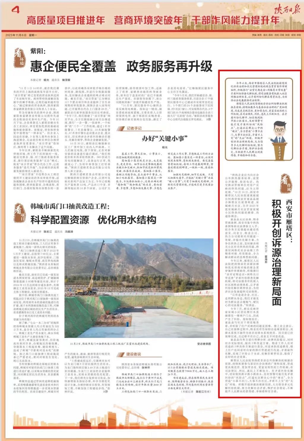 11月6日,陕西日报以《西安市雁塔区:积极开创诉源治理新局面》为题,对雁塔区法院坚持把非诉讼纠纷解决机制挺在前面,持续拓展参与基层社会治理的广度和深度,推进司法便民、利民、惠民工作进行了报道。
