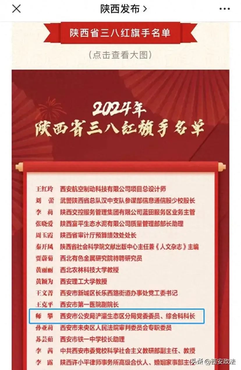 近日,陕西公布2024年“陕西省三八红旗手标兵”“陕西省三八红旗手”“陕西省三八红旗集体”名单。西安市公安局浐灞生态区分局党委委员、综合科科长师攀同志被授予“陕西省三八红旗手”称号,是全省公安系统唯一获此殊荣者。